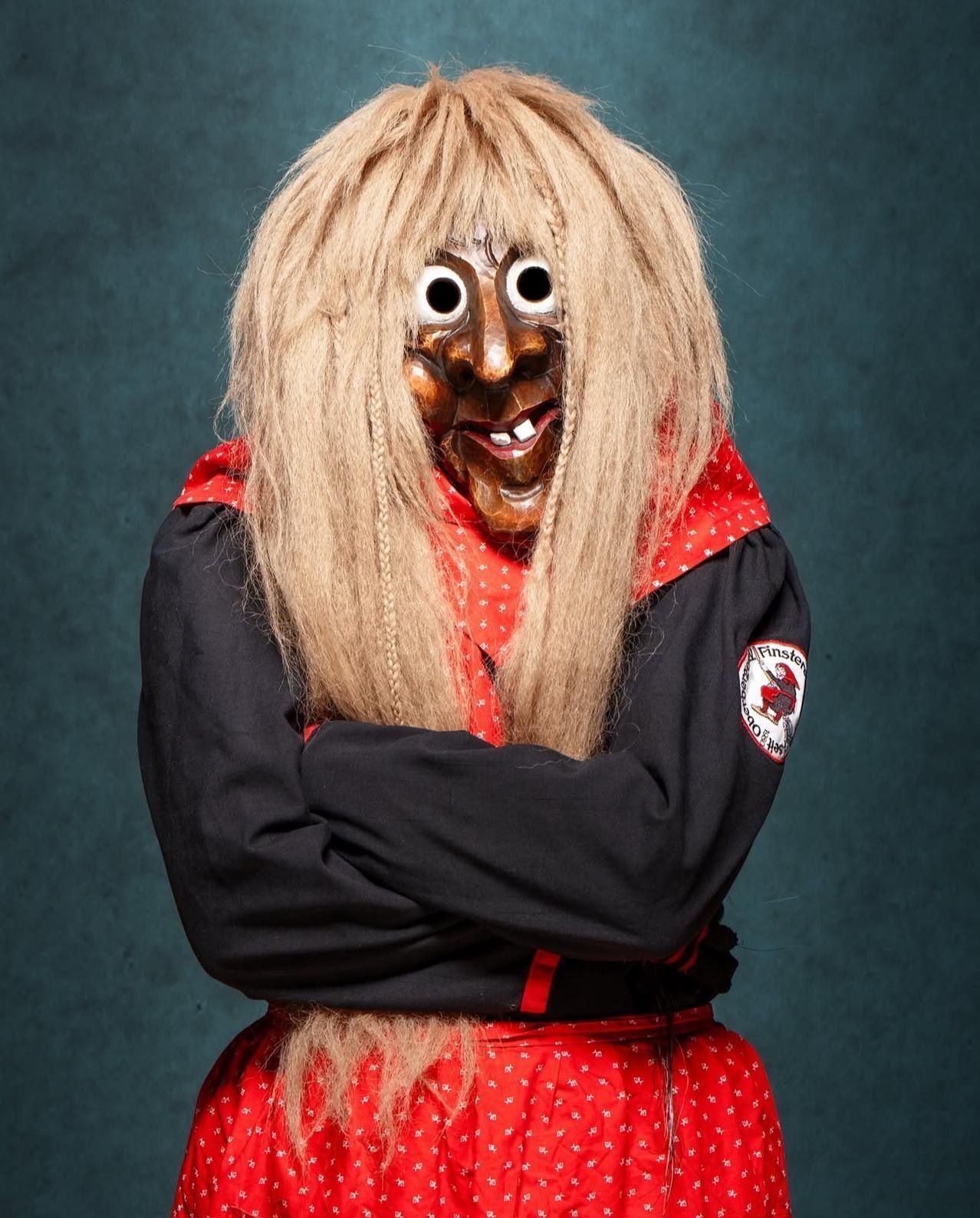 Schwarzer langer Rock, passendes schwarzes Schultertuch, weißer Pullover, weißgeblümelte rote Schürze und Kopftuch, lange weiße Spitzenunterhose, schwarz-rot gestreifte Socken, Strohschuhe, schwarze Gesichter und einen Hexenbesen.